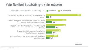 Heim-Arbeiter arbeiten deutlich öfter am Abend oder Wochenende (34 versus 3 Prozent). 20 (versus 6) Prozent berichten über Anrufe und E-Mails des Chefs außerhalb der Arbeitszeiten. Vielen fällt es zu Hause schwerer, Pausen zu machen (68 Prozent) und die Arbeit abzuschließen, um Feierabend zu machen (62 Prozent).