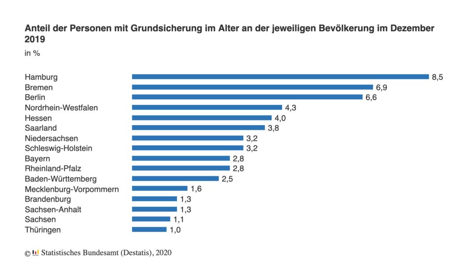Der Anteil der Personen im Rentenalter, die Grundsicherung im Alter erhielten – also das Gegenstück zu Hartz IV -, stieg von 1,7 Prozent zum Jahresende 2003 auf 3,2 Prozent im Dezember 2019, auch hier liegt die Quote im Osten niedriger als im Westen.