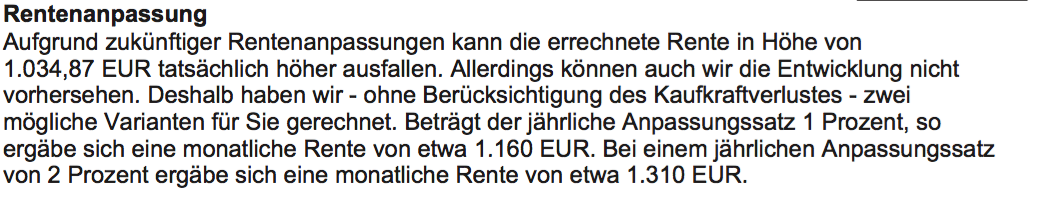 Etwas irreführend ist auch der folgende Abschnitt, in dem die Rente mit einem bzw. zwei Prozent jährlicher Dynamik hochgerechnet wird. Rechnet man 1,01 bzw. 1,02 hoch 11,5 kommt man auf einen Faktor von 1,1212 bzw. 1,2557 und damit auf 1.160 bzw. 1.300 Euro zum Rentenbeginn. (Warum in der Musterinfomation 1.310 Euro angegeben sind, können wir nicht nachvollziehen.)