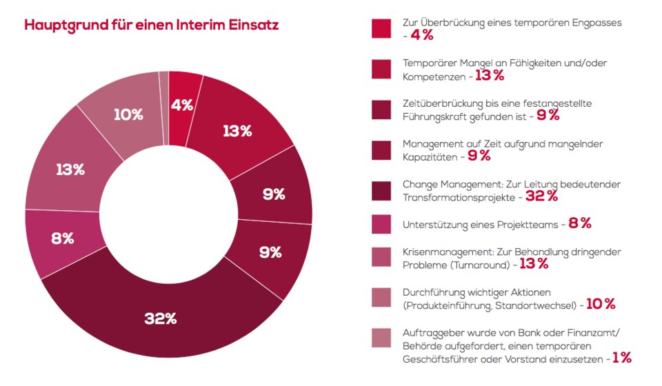 - Wichtigster Grund, einen Interim-Manager zu beauftragen, ist Change Managment. Es geht also um die Leitung wichtiger Transformationsprozesse im Unternehmen (32 %) gefolgt von Krisen-/Turnaround-Management (13 %). Ebenso häufig ist temporärer Fachkräftemangel Auslöser für ein Mandat (13 %).