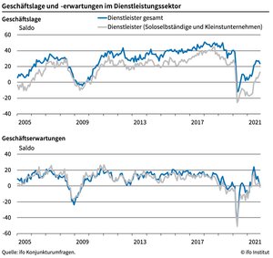 Das ifo hat Geschäftslage und -erwartungen wie oben beschrieben über einen längeren Zeitraum (bis 2005) zurückgerechnet, so dass trotz erheblicher Unsicherheitsfaktoren eine gewisse Einordnung möglich ist. Die Einschätzung der Geschäftslage der kleinen Unternehmen lag fast durchgängig unter der der Gesamtwirtschaft, wobei eine Differenz von mehr als 20 Punkten über mehrere Monate in der Vergangenheit eher ungewöhnlich war. Die kontinuierlich schlechtere Lageeinschätzung könnte auf eine strukturelle Benachteiligung kleinerer Unternehmen hindeuten und auf eine besondere Betroffenheit (bzw. nicht ausreichende Unterstützung) in der Corona-Krise.