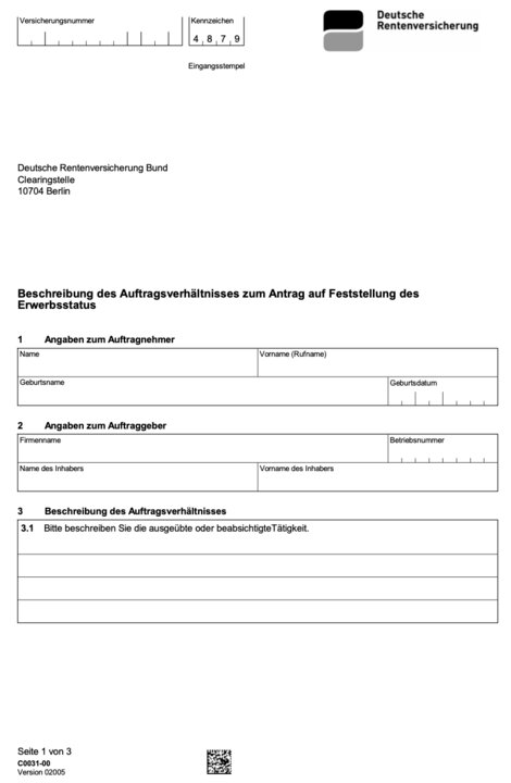 Vorab: Es gibt keine Pflicht, diesen Antrag auszufüllen. Das Verfahren sei Zweifelsfällen vorbehalten, schreibt die DRV in ihren Formular-Erläuterungen V0028. "Ein Antrag auf Feststellung des Erwerbsstatus sollte daher gestellt werden, wenn Unsicherheit über den Erwerbsstatus des Auftragnehmers besteht." Dann können Auftraggeber oder -nehmer den Antrag ausfüllen.