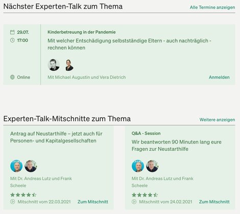 Die Experten-Talks, Regional- und Branchengruppen-Veranstaltungen sind ebenfalls an verschiedensten Stellen der Website präsent. Regionalgruppensprecher, Experten und Moderatoren sind auf ihnen wiederum mit einer Art Visitenkarte dargestellt, die (soweit vorhanden) auf ihr Profil verlinkt. Auf den Profilseiten von Experten sind dann wiederum die von ihnen gehaltenen Talks aufgelistet.