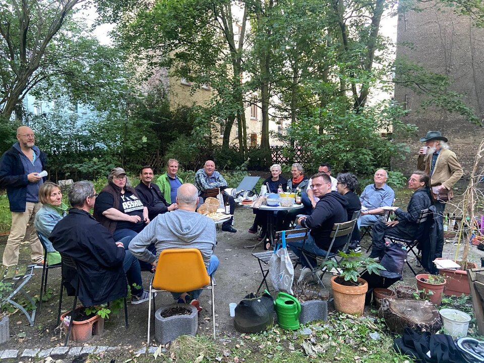 Unser langjähriger Treffpunkt ist nun eine Wildblumenwiese – deswegen mussten wir kurzfristig umdisponieren... Dank Elke Koepping und Angelika Plag konnten wir nur einige Meter weiter auf den großen Innenhof in ihrer Straße umziehen und dort gemeinsamen einen gemütlichen Abend verbringen. Die Wiedersehensfreude unserer „Stammgäste“ war groß und was uns besonders freut: wir konnten etliche neue Gesichter begrüßen!
